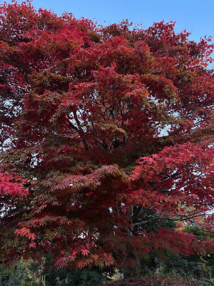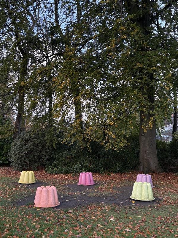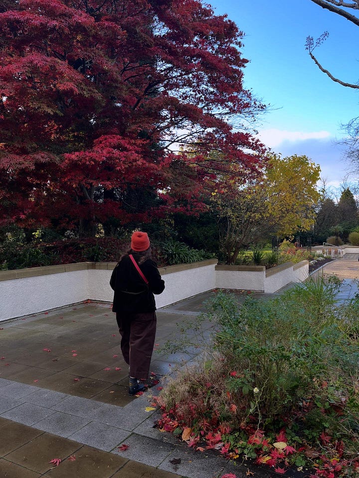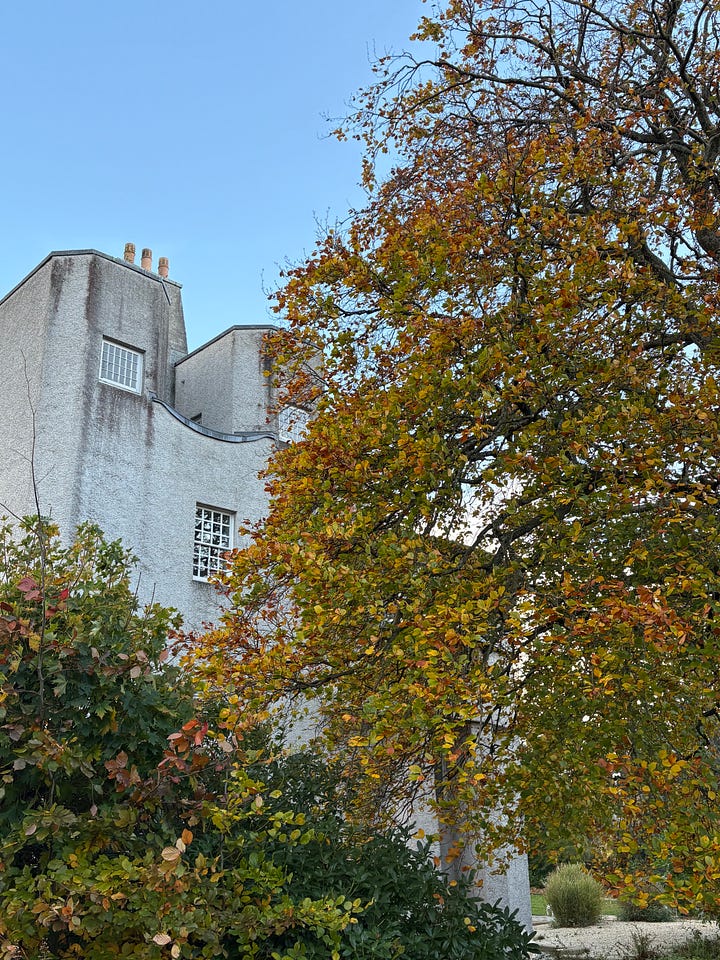 I always enjoy visiting Scotland in the autumnal months. The colder weather sets in a little earlier than in London which allows me to enjoy more layers here. Favourite parts of solo walks were looking at the trees turn from green to mustard yellows and tomato reds. On one particular day, a dear friend who also lives in Glasgow, suggested a trip to the House for an Art Lover (me!) in the Bellahouston Park. The actual house, designed by Charles Rennie Mackintosh - more on Mackintosh shortly - is now used as a somewhat museum of his design but also a wedding venue, so special! We spent quite some time outside on the grounds where I became a little obsessed about one particularly beautiful red leafed maple tree. Other highlights included lifesize jellies and a giant foot. More leafy highlights include the trees within Queens Park and the ochre trees of dreams outside of Glasgow Cathedral.