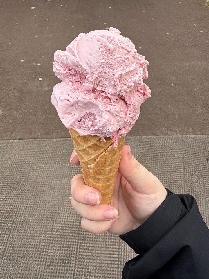 Other ice cream hours included Peacocks in Battlefield which specialised in Canadian style ice cream. I enjoyed a couple scoops on a very rainy afternoon after some thrifting in local charity shops. Here I ordered the Canadian campfire, a s’mores inspired flavour that did indeed taste sweet and smoky, and their Lebanese breakfast which was coffee, cardamom + caramel flavour, although I did not taste the coffee or cardamom flavours here. Another memorable moment was a classic strawberry scoop at the Eusebi Deli in the West End, pictured below.