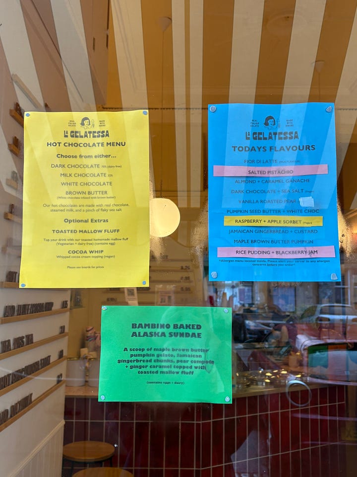 I visited La Gelatessa in Strathbungo, twice, opting for different flavour combinations on both visits of course. I love their branding and flavour menus - even so far as the coloured paper to cross out sold-out flavours and to announce what is to replace them. My first combination was apple + raspberry sorbet with rice pudding + blackberry jam gelato. I recently had rice pudding gelato during a work trip to Florence and expected this to be similar however it was far sweeter with the jam addition. The Italian version was more honest to the rice element with grains of pudding rice running through for a little crunch, which I think I preferred. I opted for vanilla roasted pear and pumpkin seed butter + white choc gelato on my second round. I am still dreaming about the vanilla roasted pear and may have put an ice cream machine on my Christmas list to recreate it.